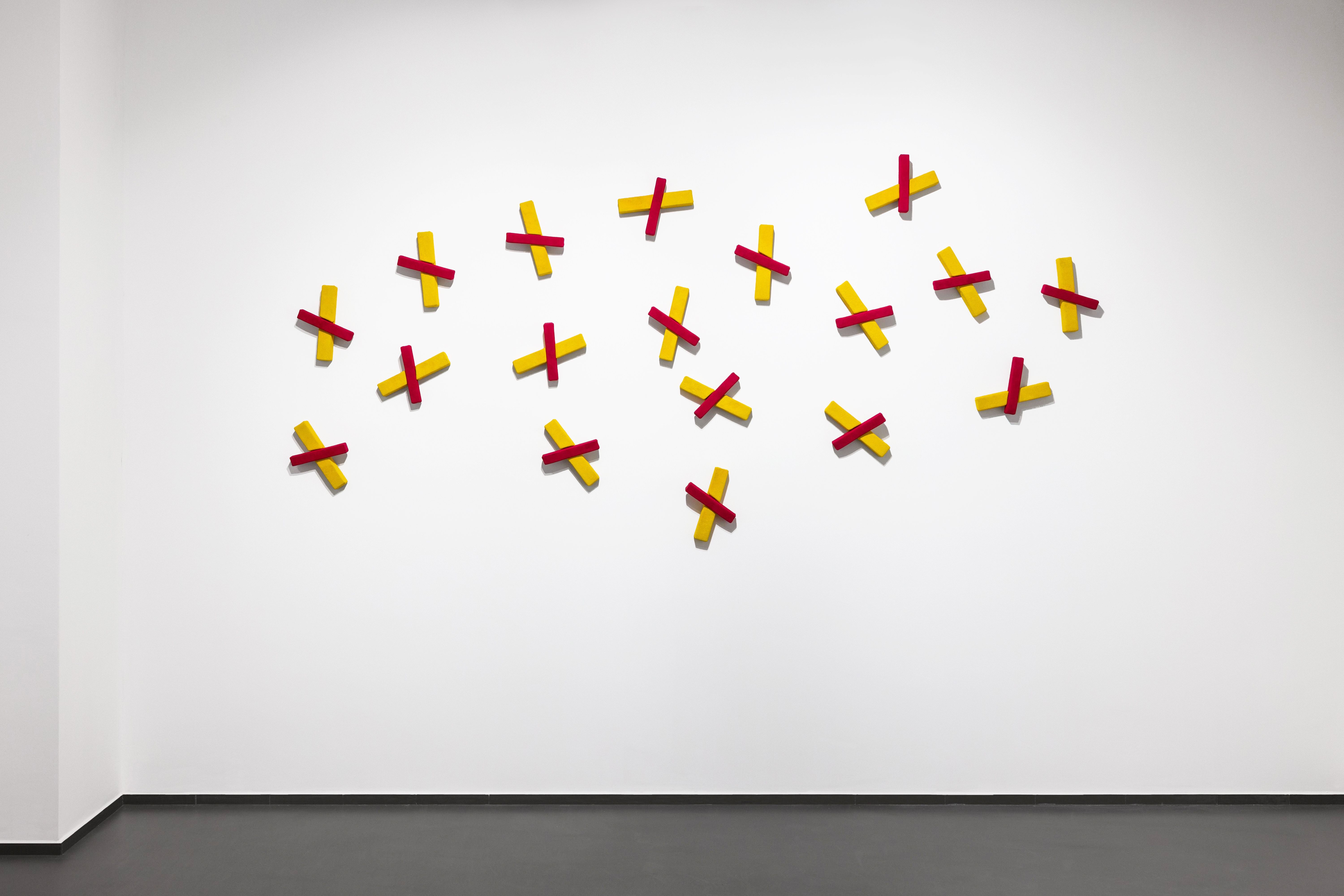 Negli anni Ottanta arricchisce questa poetica introducendo nuove relazioni tra i moduli disseminati. Sperimenta opere in cui due elementi vengono incrociati a forma di “X”, creando un dialogo di tensione e armonia. A questo periodo appartiene Pittura G.R. (1982), dove accoppia 36 mollettoni dipinti (18 gialli e 18 rossi) trasformandoli in elementi scultorei da disporre sulla parete. Ne nasce una sinfonia di forme e colori che supera la concezione tradizionale di “spazio del quadro”.