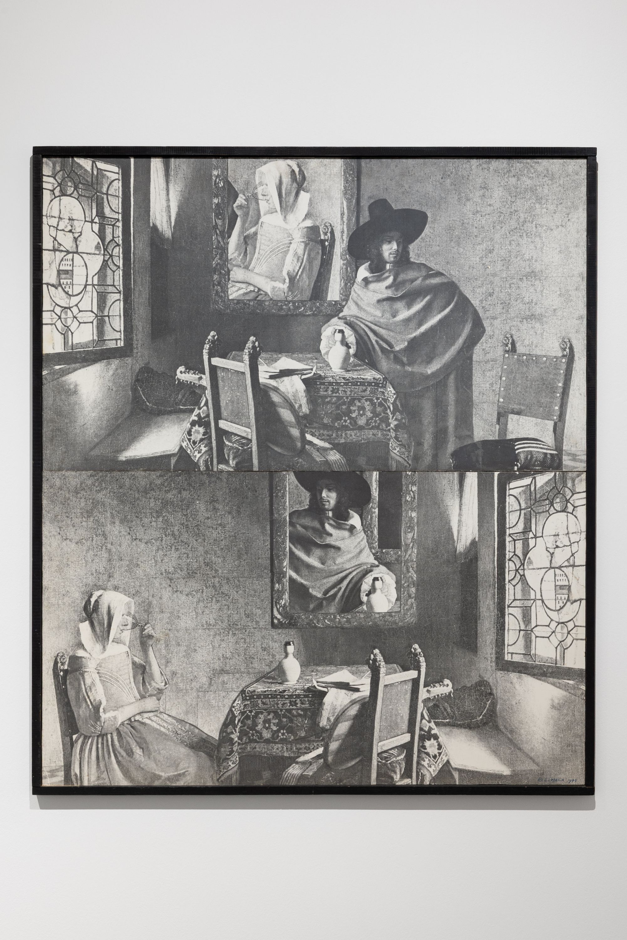 Negli anni Settanta si occupa di un progetto particolare: gli Apocrifi. Con questo termine indica opere che immaginava come se fossero state create da grandi maestri del passato, come Vermeer, Magritte o De Chirico, ma che in realtà erano sue invenzioni. Lumaca riprende l’atmosfera raccolta e silenziosa dei dipinti Vermeer, rielaborandola con la fotografia e il montaggio: come succede nel dittico fotografico Due gentiluomini e due donne che bevono (1974). L’opera non è una copia, ma una riflessione sul rapporto tra passato e presente, tra realismo e artificio, e mostra la capacità dell’artista di trasformare la citazione storica in un gioco concettuale.