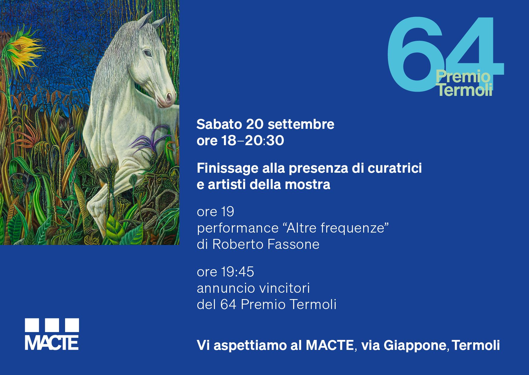 Nel corso del finissage, alla presenza di artisti e curatrici del 64 Premio Termoli, l’artista Roberto Fassone presenterà al MACTE Altre frequenze, una performance ibrida e dinamica ispirata ai passaggi del libro dallo stesso titolo che Fassone sta scrivendo dal 2020, e che, con le parole dell’artista, conterrà: “Vicende legate alle classifiche, ai compleanni, agli alieni e alle paure che ci beviamo al fondo della strada saranno protagoniste di un momento di condivisione e stranezza”.