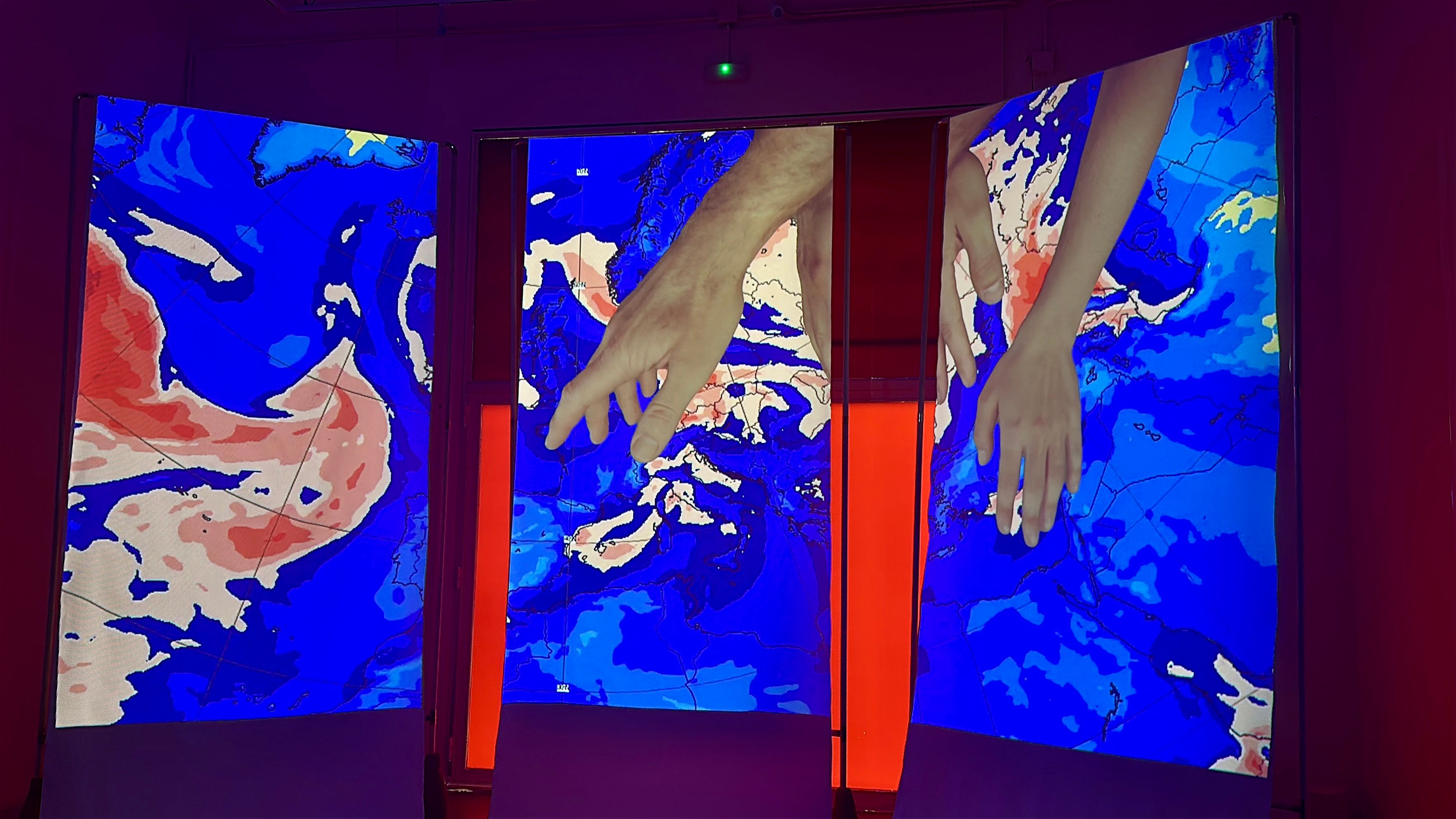 Ingrid Hora presenta invece Cloud Catchers a cura di Emanuele Guidi, un’esposizione che prende forma da immagini in movimento filmate dall’artista nel Mar Mediterraneo e montate secondo una coreografia visiva. Il ritmo serrato del video dialoga con flussi di immagini provenienti dai social media e da piattaforme scientifiche, evocando il desiderio ancestrale dell’umanità di dominare e contenere l’acqua. Il progetto si concretizza in un’installazione video a tre canali, arricchita da interventi scultorei che ampliano la riflessione sulle forme e sui dispositivi utilizzati per raccogliere, condensare e preservare questa risorsa primaria.
